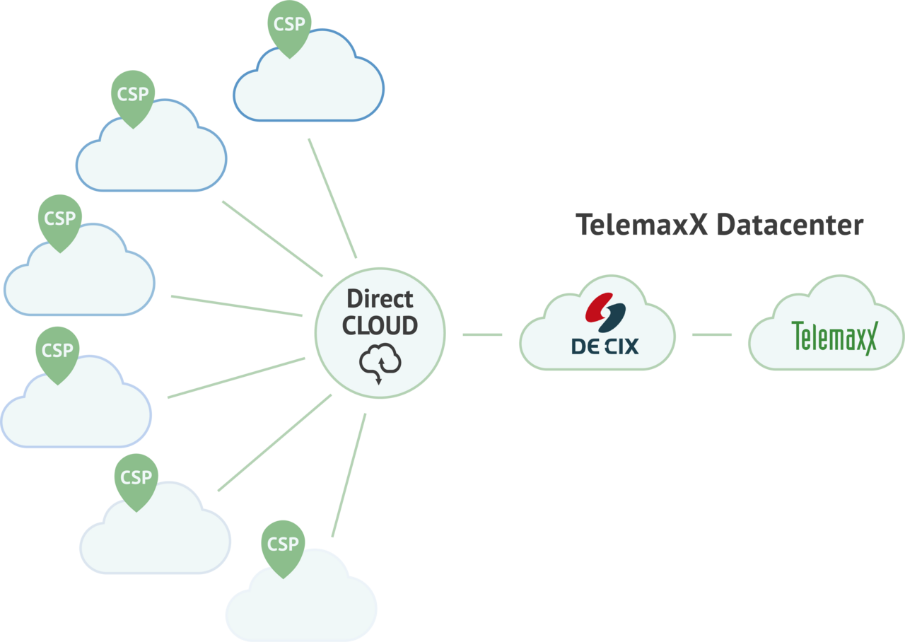 DirectCLOUD | Mit den Interconnection Services des DE-CIX kombinieren Sie die TelemaxX Cloud mit den Hyperscalern und können entsprechend Ihre Multi Cloud-Strategie umsetzen. Kritische Daten bleiben in der private Cloud im Rechenzentrum und andere Daten können Sie beliebig in den Clouds der Hyperscaler verwalten. |